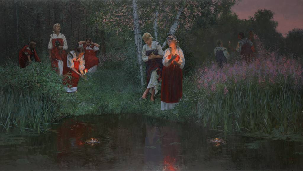 Иван_Купала.Гадание_на_венках.2008.Доска,масло150х85_смJednemu chłopu w dzień przed nocą kupalną zginęły konie. Szukał ich po wsi, po łąkach i pastwiskach. Na próżno.