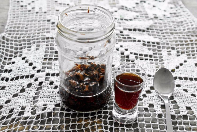 Według starych receptur pączki trzeba zemleć i zalać gorącym alkoholem 40 %. Ja zrobiłam im kilkuminutową kąpiel wodną w zakręconym słoiczku, w temperaturze około 60 st. C. Potem wyjęłam i pozostawiłam w ciepłym miejscu na 10 dni (w literaturze jest podawany czas 7-14 dni). Macerat codziennie trzeba wstrząsnąć. Po tym czasie można tinkturę przelać przez sitko i pozostawić w ciemnym miejscu. Na szczęście zakupiłam sporo brązowych butelek, nie muszę się już bać o dostęp światła. By wzmocnić działanie można nalewkę zrobić na spirytusie maforowym, zwiększy się działanie rozgrzewające. Takim maceratem możemy przecierać chore miejsca, czyli bóle mięśni, stawów, nerwobóle. Doskonała też na zakwaszone mięśnie.