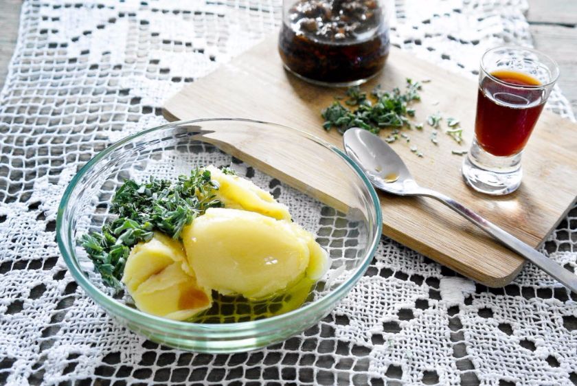 A moja maść będzie z użyciem tłuszczu gęsiego, ale zamiennie możecie zastosować masło shea, masło kakaowe. Pączki topoli kroję drobno nożem, dodaję do nich 2/3 łyżeczki mocno skoncentrowanego maceratu alkoholowego z kory dębu (garbniki są barierą dla bakterii i grzybów), mieszam, pzostawiam na 15 minut, żeby alkohol uaktywnił związki czynne w pączkach. Zalewam olejem – tak, żeby tylko przykrył warstwę pączków, robię to dlatego, że mam mało pączków. Zakręcony słoiczek wkładam do kąpieli wodnej do wody mocno ciepłej, ale nie wrzącej, zostawiam na kilkanaście minut. Teraz słoik zakręcam i zostawiam w cieple na 7-14 dni, codziennie wstrząsam. Po 10 dniach przecedzam olej topolowy przez sitko i gazę, bardzo starannie, żeby nie pozostała żadna drobinka, która mogłaby stanowić pożywkę dla rozwoju bakterii, czy grzybów. Olej ten łączę w kąpieli wodnej z tłuszczem gęsim/smalcem wieprzowym/masłem shea oraz z pociętym drobno piołunem. Pozostawiam w kąpieli wodnej na 20 minut i po wyjęciu na dodatkową godzinę, żeby zaistniał zapach piołunu. Po tym czasie przelewam do słoika dla zrobienia zdjęcia, ale tak naprawdę zamknę ją w plastikowym pudełeczku, by nie docierało światło.