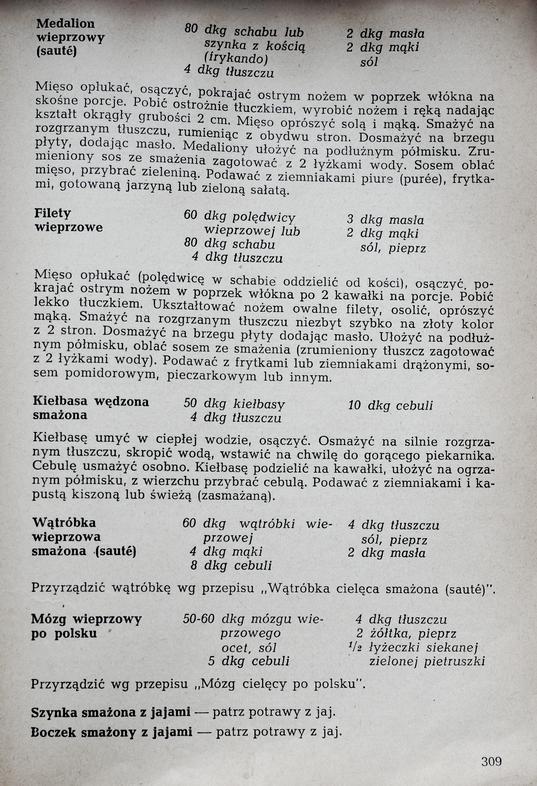 Pewnym paradoksem Kuchni polskiej jest proponowanie potraw składających się wymyślnych produktów. Lata ’50, jak już wspomniałam w rozdziale poświęconym ewolucji upodobań kulinarnych Polaków, nie obfitowały w rozmaitości, dlatego niektóre z przepisów nie miały racji bytu, choć ukazywały się w każdym nowym wydaniu Niedostępność podstawowych składników do ich przyrządzenia dyskwalifikowała je z jadłospisu przeciętnego obywatela
