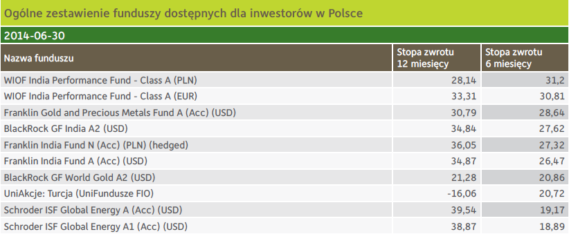 Przyglądając się głównemu zestawieniu wyników funduszy, w oczy rzucają się przede wszystkim dwa typy rozwiązań. Pierwszy to fundusze indyjskie, drugi –  fundusze złota i metali szlachetnych. Indyjska giełda, podobnie zresztą jak większość rynków wschodzących, ucierpiała w 2013 i na początku 2014 roku. Co więcej, większość walut krajów gospodarek wschodzących osłabiła się w stosunku do dolara amerykańskiego. Co prawda w przypadku rupii indyjskiej ten proces trwał już od pewnego czasu i przecena w okresie ostatnich trzech lat wyniosła ponad 30 proc., to jednak nie pozostało to bez wpływu na późniejsze odreagowanie.  Wyborcze zwycięstwo Narendra Damodardas Modi’ego był antycypowany przez inwestorów, a to pomogło rynkowi. Rozwiązania takie jak WIOF India Performance Fund – Class A (PLN), BlackRock GF India A2 (USD), Franklin India Fund N (Acc) (PLN) (hedged) pozwoliły na zarobek w granicach 30 proc. w okresie pierwszych sześciu miesięcy 2014 roku. Sporo. Ponad 25 proc. udało się uzyskać inwestorom, którzy zdecydowali się na pośrednią inwestycję w złoto, np. w fundusze Franklin Gold and Precious Metals Fund A (Acc) (USD) oraz BlackRock GF World Gold A2 (USD).