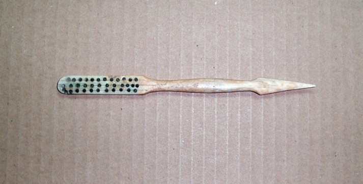 Nasz „eksponat”, wykonany z wypolerowanej kości zwierzęcej, posiada podłużną główkę zaopatrzoną w ręcznie wywiercone otwory, w których niegdyś zamocowane było włosie. Końcówce rączki nie przypadkowo nadano kształt szpikulca – miała ona swoje zastosowanie, zapewne w celu dokonywania za jej pomocą dodatkowych zabiegów higienicznych w jamie ustnej.