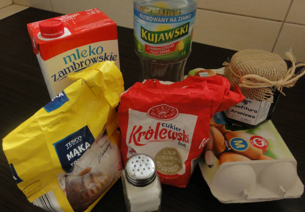 Do miski wlewamy mleko i dodajemy uprzednio umyte jajka. Dosypujemy szczyptę soli i cukier. Wszystkie składniki mieszamy używając trzepaczki aż do powstania piany. Wsypujemy mąkę i również mieszamy. Jeżeli ciasto będzie zbyt gęste dolewamy mleka, jeżeli zbyt rzadkie wsypujemy mąkę. Do przygotowanego ciasta wlewamy 5 łyżek oleju, żeby nie używać go na patelni. Wtedy naleśniki nie będą zbyt tłuste. Na patelnię wlewamy kropelkę oleju i czekamy aż się rozgrzeje. Na rozgrzaną patelnie wlewamy ciasto i rozprowadzamy aby ciasto uzyskało okrągły kształt. Usmażone naleśniki smarujemy konfiturą z aronii!