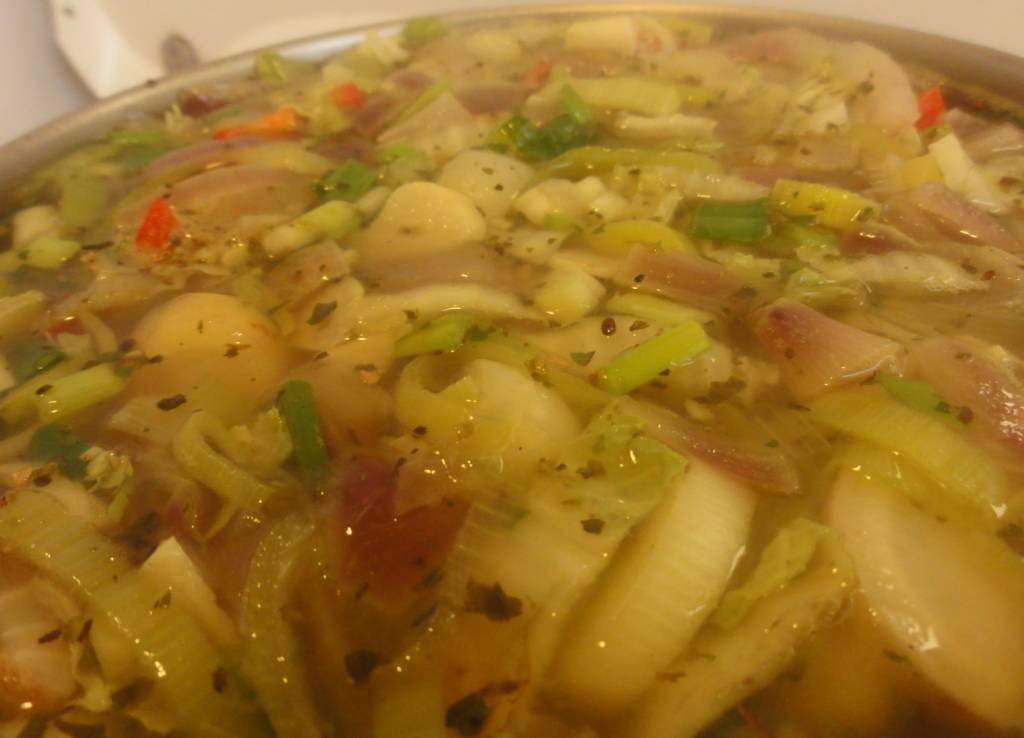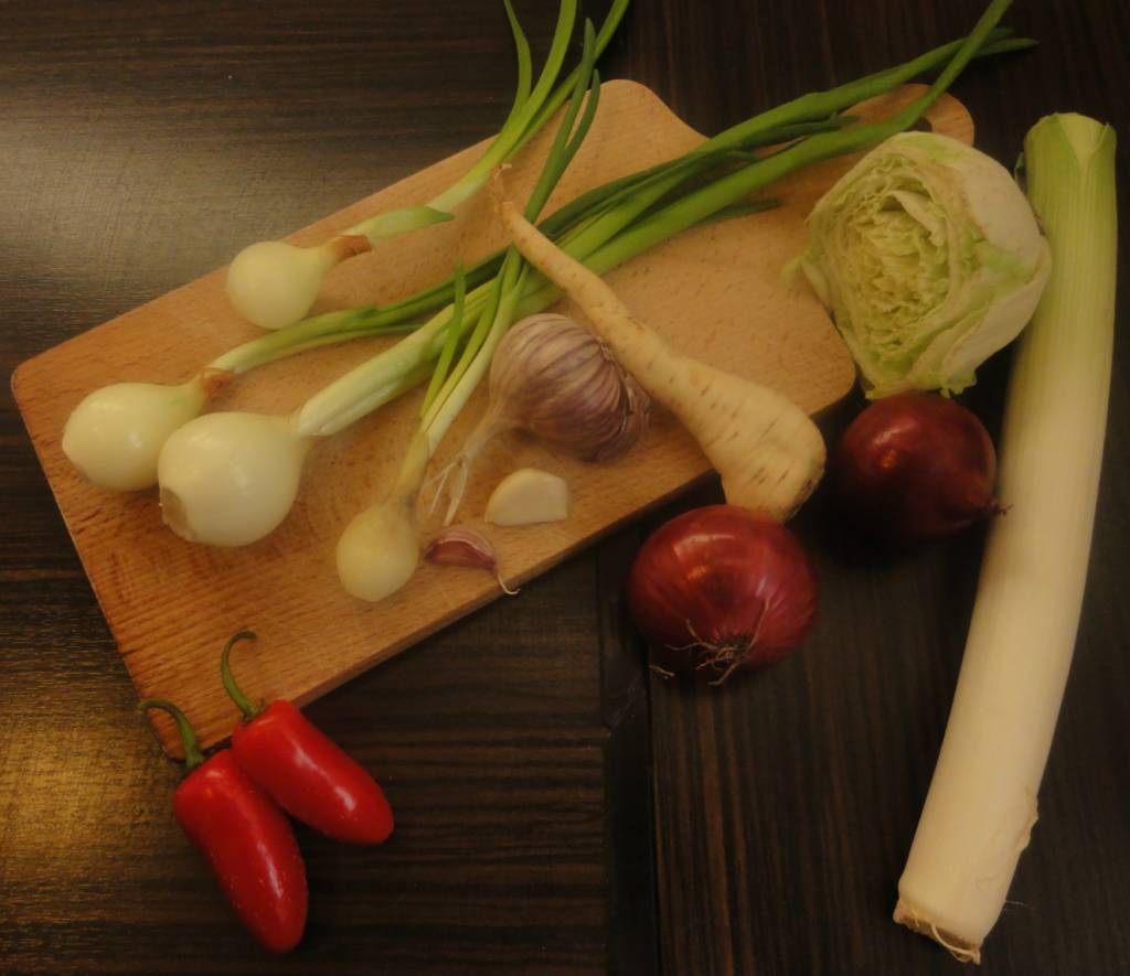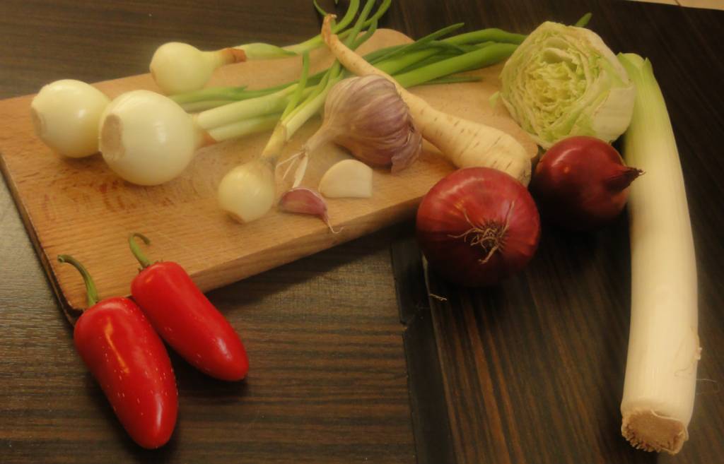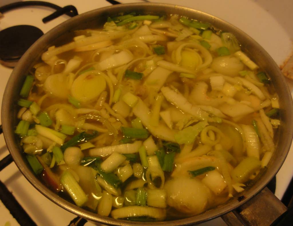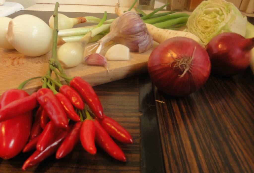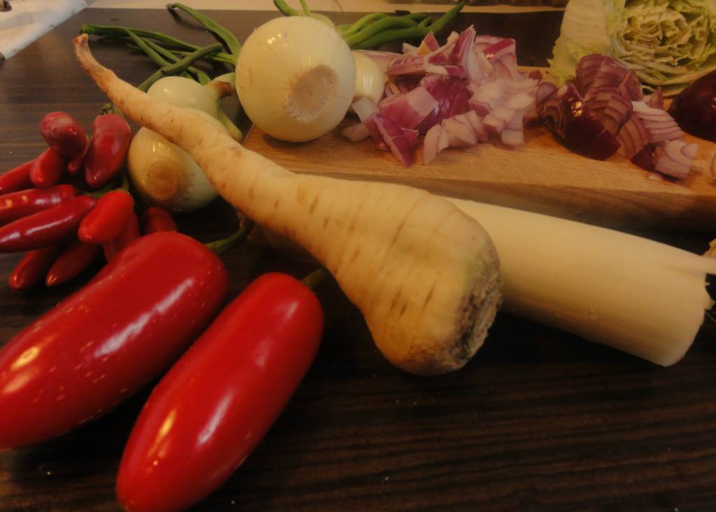 Teraz zupa kkelis potrzebuje kapusty pekińskiej, najlepiej pociętej w małe kawałki. Zaraz za nią dodajemy cebulkę dymkę. Należy pamiętać o tym, że zielony ogonek cebulki należy oderwać i łamać nad zupą. Następnie rozetrzeć w rękach, żeby ogonek puścił soki. Dopiero wtedy dodajemy ją do zupy. Dorzucamy także korzeń pietruszki. Mieszamy, mieszamy i mieszamy!
