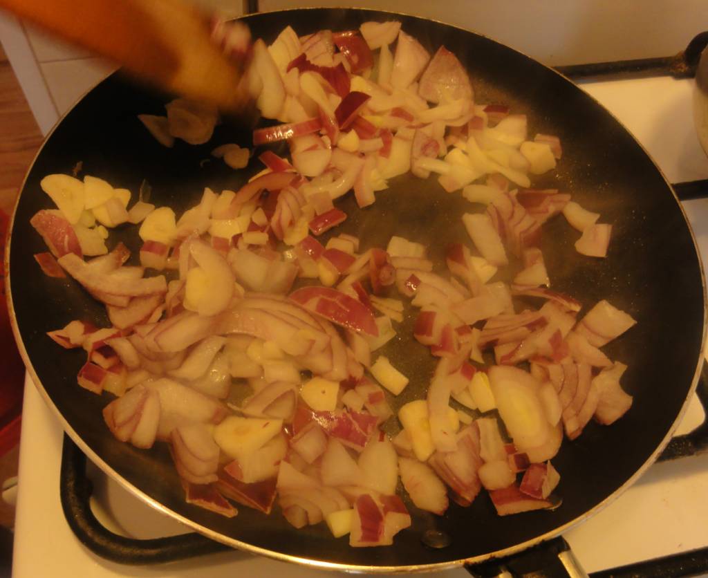 Zupę przygotowuje się bardzo prosto. Na początku kroimy cebulę i wrzucamy na patelnie. Po ok. 2 minutach dodajemy pokrojony czosnek. Smażymy ok. 3 minutach, aż warzywa nabiorą kolorów.