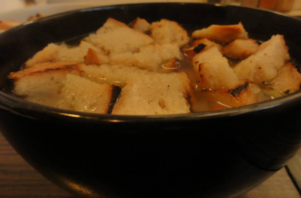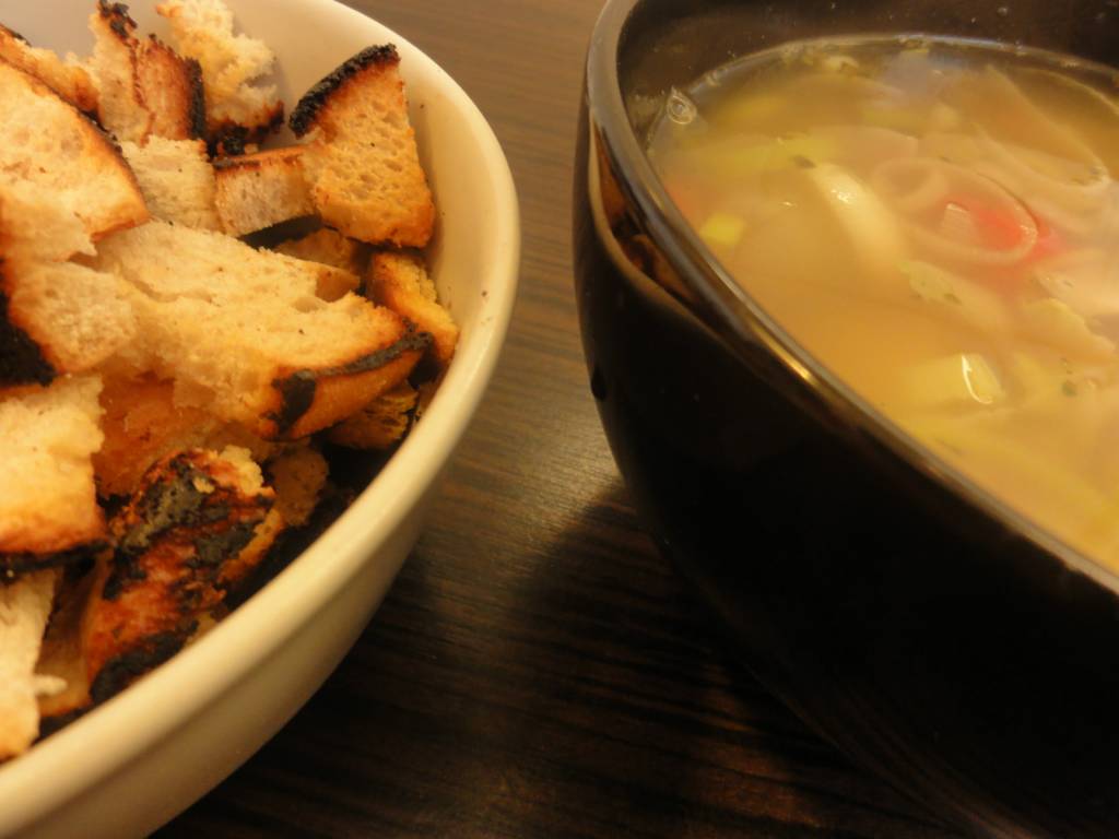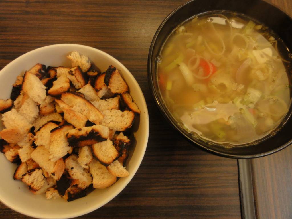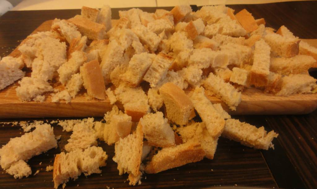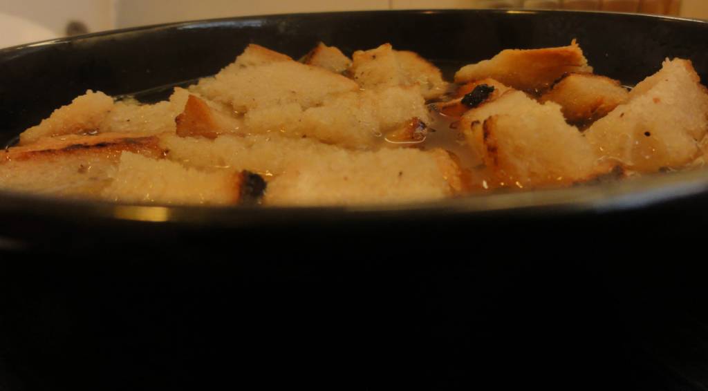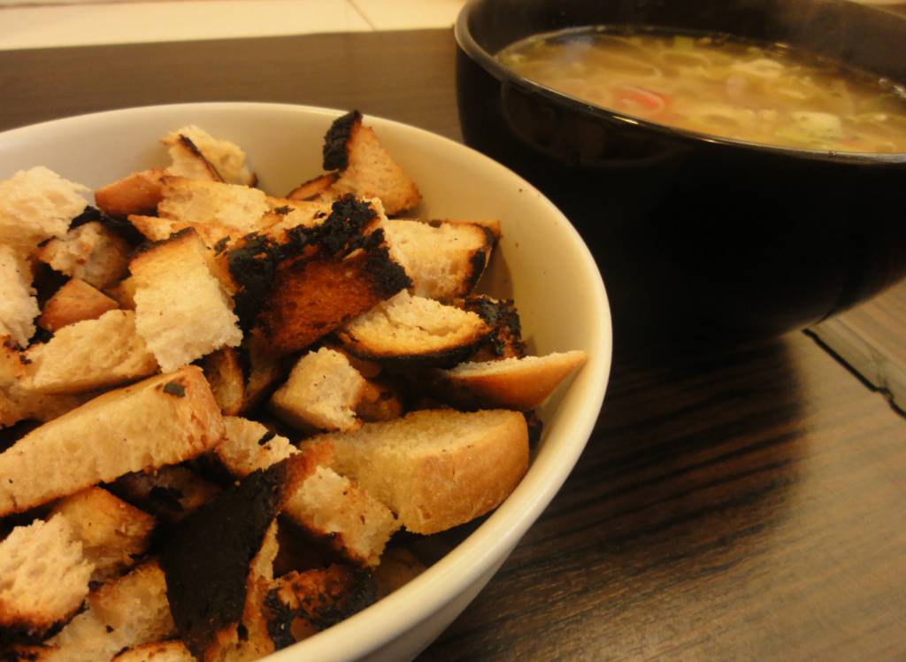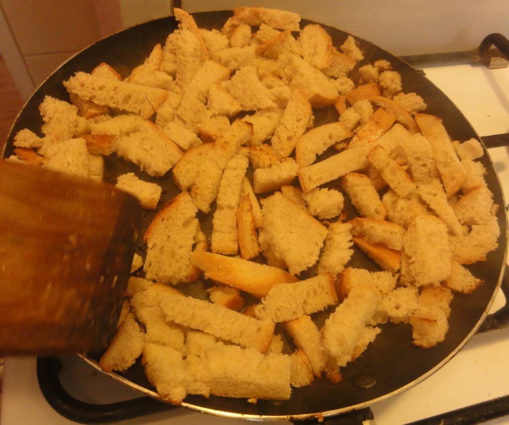 Patelnie smarujemy delikatną warstwą masła i wrzucamy chleb. Podgrzewamy przez kilka minut, aż grzanki osiągną właściwy kolor. Następnie przesypujemy je do miski i odstawiamy na bok. Nie wolno zapomnieć o ciągłym mieszaniu zupy.
