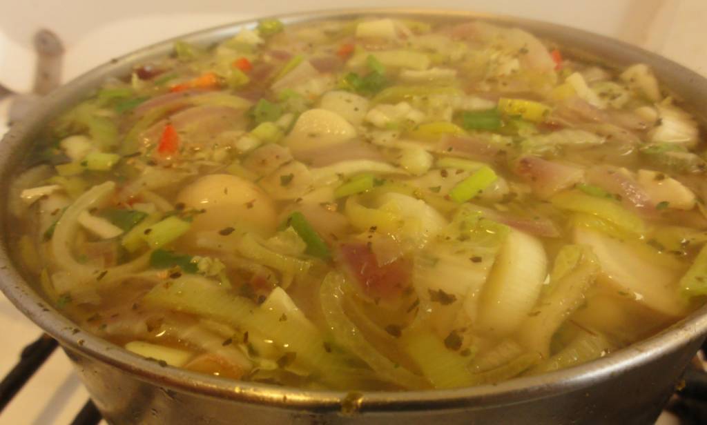Następnie wrzucamy je do garnka. Zalewamy bulionem i dodajemy pocięty por. Zupę trzymamy na minimalnym ogniu, cały czas mieszając. Po 5 minutach dodajemy marchewkę.
